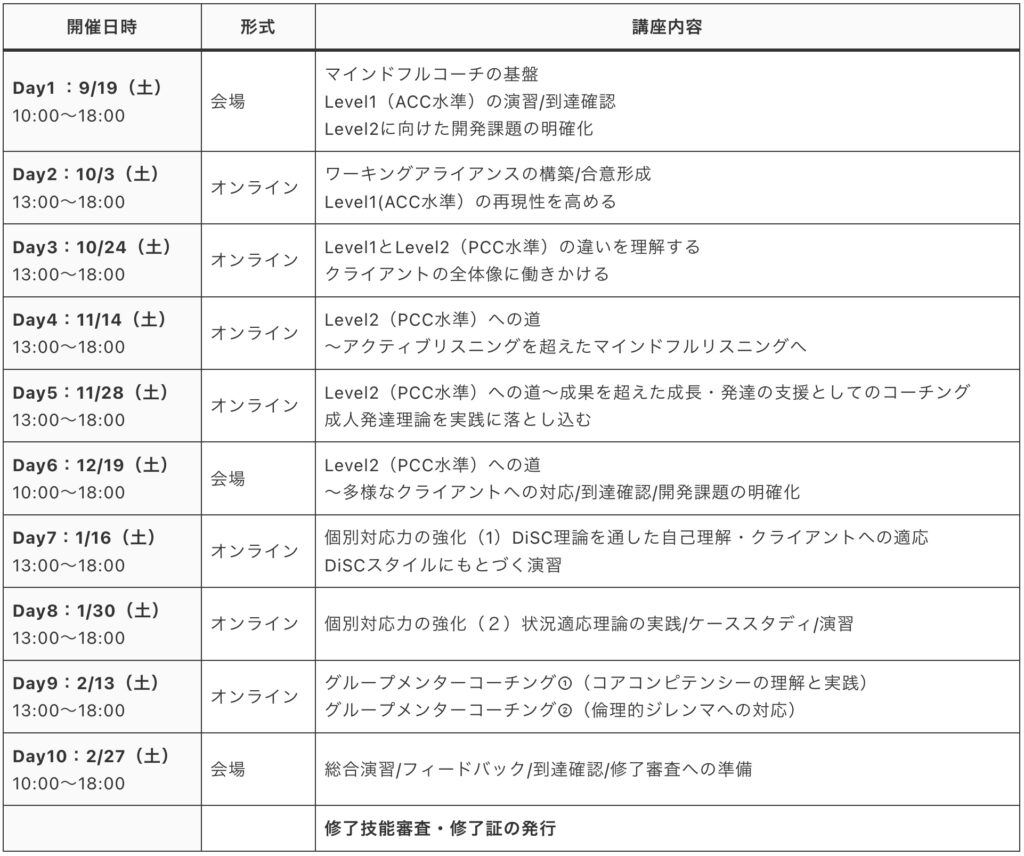 | Day8:9/26(土) 10:00〜18:00 | 対面 | マインドフルネスとコーチングスキルの統合 |