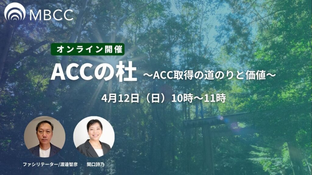 直近1年ほどでACCを取得した(とご連絡いただいた)MBCCメンバーをお招きし などなど、「こうすればうまくいく!座談会」を開催します。 ACCを新たに取得されたメンバーをみんなでお祝い&ACC取得最新情報をGetしまし … 続きを読む 【4/12日】無料オンラインイベント「ACCの杜」開催のお知らせ